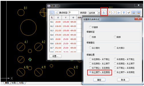如下图所示,执行命令后,设计师就可以指定坐标的统计原点与名称,选择需要标注的对象后对应的孔表就可以直接绘制出来了。此外,通过配置界面,还可以设置孔的排序方式,同时不同类型的孔也做了不同的标识,如图中的A.1、A.2…B.1、B.2…