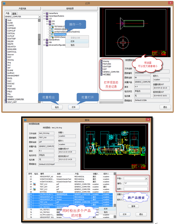 第三,通过图纸的批量检入检出功能,使得工程师可以同时操作多个对象,简化原来需要逐个打开查找所带来的繁琐“体力劳动”。此外,跨产品的索引,支持同步在线预览等功能的应用,对有效提高新车型的开发效率起到很好的促进。