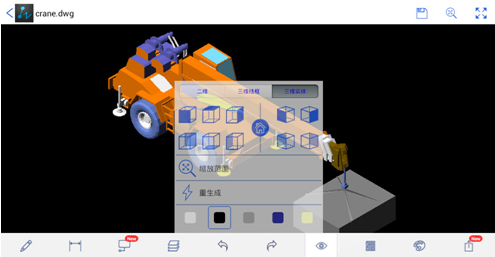三维视图和视图控制功能是这个新版中最大的亮点,设计师可以在Touch中自由查看精美的3D模型。luck18网址 Touch安卓版V1.2的视图菜单中提供了三种不同的视觉样式可供自由切换(二维线框、三维线框和三维实体),同时我们还可以在三维视图中平移、缩放、动态观察图形,从而可以仔细地查看模型的每一个角落。