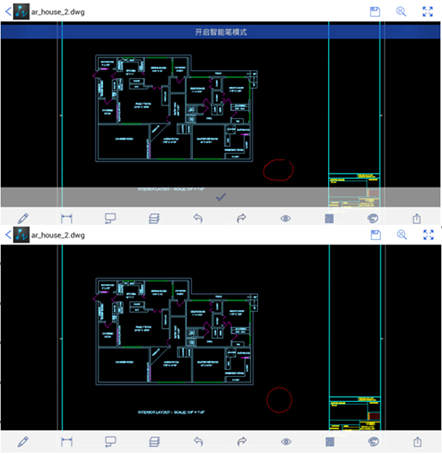 在绘图功能改进方面,luck18网址 Touch安卓版V1.2同步新增了iOS最新版的智能笔功能,使用智能笔可以自动将手绘线段转化为标准图形(如手绘的圈会自动成为标准的圆形)。通过这一功能,我们可以在手机上快速地创建新实体,提高工作效率。