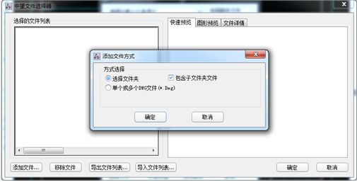 用户可在弹出的对话框中通过选择文件按钮,多次选择计算机中的文件或文件夹。值得一提的是,所选择的文件还可以通过预览功能了解图形的信息,并可将当次选择的图形文件导出为文件列表,以备其他的处理操作时选用。选择完成后确定,执行 “开始处理”操作,软件就会自动按照脚本的命令对每一张图纸完成相同的操作步骤,非常的智能高效。