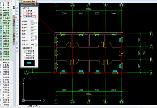 通过采暖菜单中的“散热器”功能,软件提供有三种方式布置散热器,分别是“任意布置”、“沿墙布置”、“窗中布置”。我们选择“窗中布置”,然后设置好散热器的参数,框选图形,就可以非常方便的将散热器布置在窗子的中间,如下图二所示。