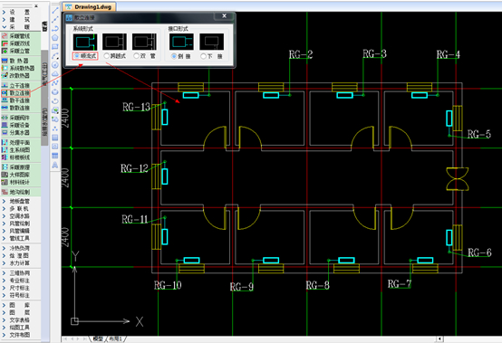 我们选择“顺流式”,然后选择图形中的散热器和立管,就可以实现散立连接。最终的效果如下图三所示。