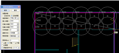 首先布置“1”区喷头,在xelega给排水中执行“矩形喷头”命令,选择不同的危险等级来确定最大最小行列间距,这里选择“中危Ⅰ级”,管标高设置3米,勾选预演保护半径。在布置喷头的过程中,设计师可以即时查看是否覆盖全部区域。值得一提的是,在喷头布置的同时,支管也一起随之布置连接完成,非常快速高效。