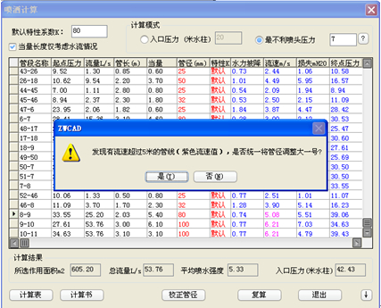 喷淋计算以图形绘制过程中设置的相关参数为基础,根据自动喷水灭火系统设计规范计算出水管中水的流速、流量、压力等,当流速大于5m/s时将以紫色显示提示设计师进行管径校正,校正管径后图纸中的管径自动根据计算结果进行管径调整。同时,xelega给排水可以快速生成计算书和计算表。