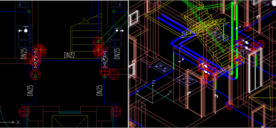 三维碰撞检查是xelega水暖电率先推出的新功能,对保证设计的合理性有着积极作用。在xelega专业模块中,建筑的梁柱,水暖电设计中的管道、桥架等都可以进行碰撞检查,且软件提供的碰撞检查结果有多种表达方式:一、平面碰撞的部分会以红色小球表示;二、如需标示,软件可在平面图中以标注的方式表达出来;三、利用三维模型视图或者碰撞模型方式显示。碰撞检查可以帮助设计师防患于未然,把问题解决在设计阶段。