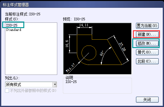 2、 在原有的标注样式上修改:选中原有样式——修改,如果需要新建标注样式则直接选择新建,如下图
