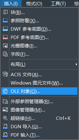 1.首先打开CAD软件,点击上方工具栏【插入】—【OLE对象】,如下图所示: