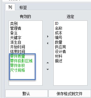 5. 为每个零件定制完成之后,重复标准BOM表的创建过程,再去到工程图使用BOM表的命令,会发现列的标签项已经多了刚才创建的用户属性,可以添加到选定。