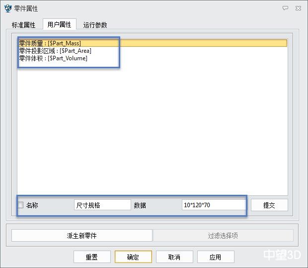 4. 接下来就通过使用用户属性,调用这些变量。工具->零件属性->用户属性。在这里需要注意的是,第一,由于这次定制的是非标准属性,所以使用用户属性进行自定义的BOM零件信息,其中标准标量格式为 [$+变量名],如零件质量为 [$Part_Mass]。第二,通过用户属性可以使用变量调用数值,也可以输入名称、数据,例如尺寸规格,可以直接输入你想要的数据 10*120*70。