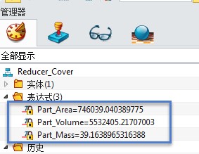 3. 操作完成后,在历史树管理器,你将会看到已经有相应的信息变量生成,包括零件投影区域(Part_Area),零件体积(Part_Volume),零件质量(Part_Mass)。