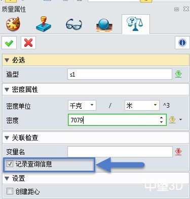 2. 在质量属性 命令的对话框,输入具体的零件密度数值,并启用选项“记录查询信息”。(注:如有定义零件材料,xelega3D将自动读取零件密度星系)