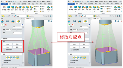 5. 在使用放样生成曲面时,系统默认是生成一张完整的曲面。但是在设计过程中,为了后续工序以及设计要求,往往是需要在截面的关键节点处分割曲面的,所以就需要在截面中添加关键的控制节点,如下图:
