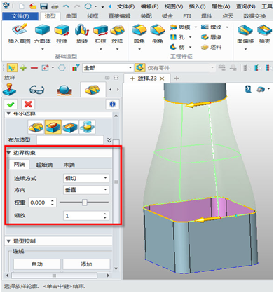 3. 创建出来的曲面与已存在曲面的连接关系可以通过“边界约束”来进行定义。