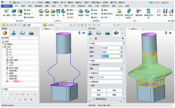 4. 当在两个放样截面之间有特定类型的侧面轮廓线约束时,就可以使用“驱动曲线放样”或是“双轨放样”来完成,这两个功能是允许用户选择侧面约束线来约束侧面轮廓的。