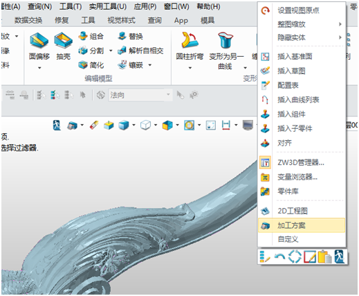 第二步 :进入加工界面,屏幕空白处点键鼠标右键,选择加工方案(如图3),选择默认模板。