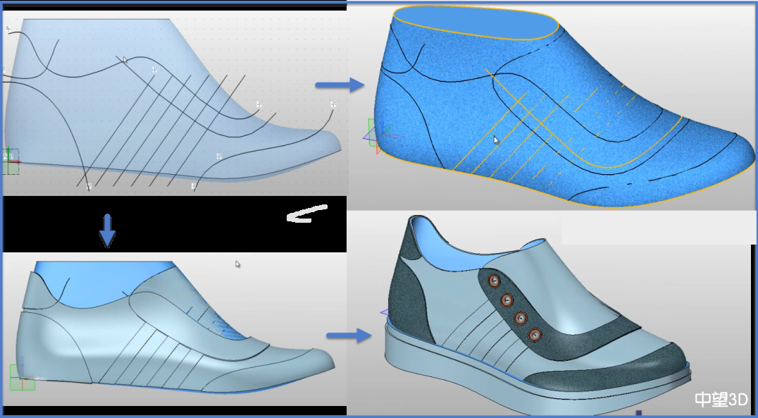 (2)很多时候我们会通过接收客户的鞋楦模型开始设计。xelega3D可以通过导入客户的鞋楦模型,也可以调用集成的鞋楦库,通过2D草绘或者3D曲线的方式,创建楦体上的投影线,进而根据设计要求生成不同的鞋面片体。