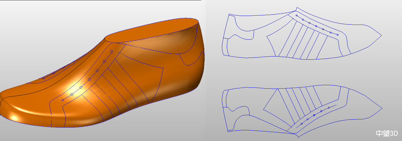 (4) 其中还有xelega3D 的展开到面的功能,可以快速的为皮革类或布料类的鞋面进行分片展开,生成2D平面线条进行裁剪和下料。