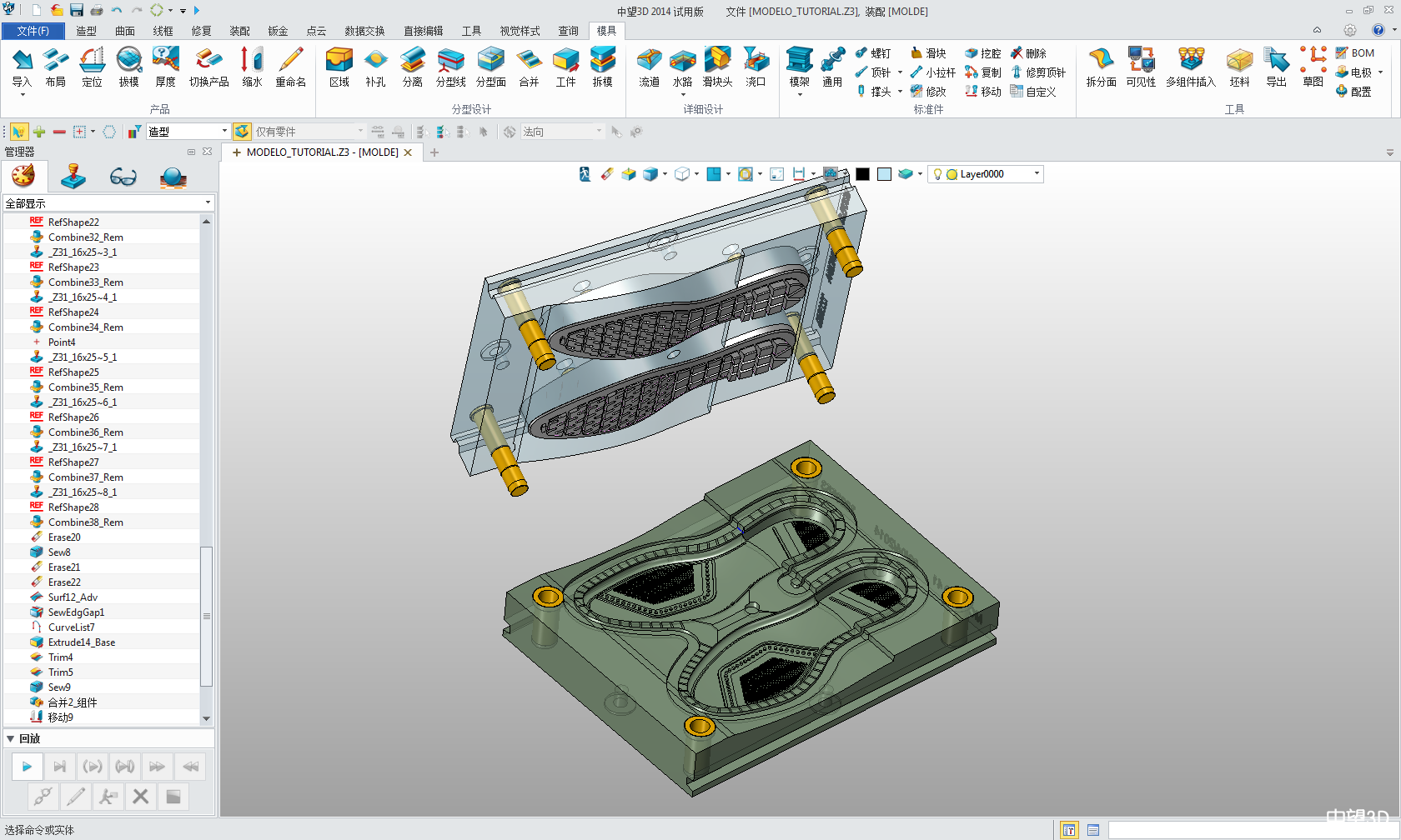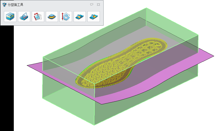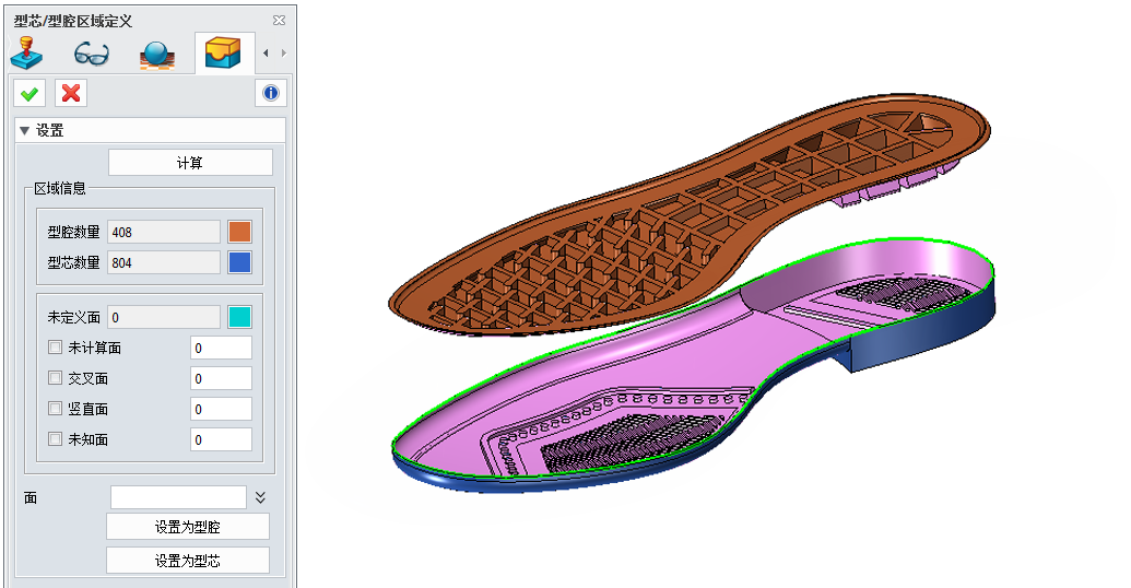(1) 鞋子中存在大量的塑胶或者其它橡塑材料,必须使用模具来成型,xelega3D专业版拥有全流程的塑胶模具设计模块,满足导入产品、多型腔布局、分型及插入模架标准件等设计要求。 其中在分型上xelega3D提供分型线及颜色区域划分两种方法进行分模,根据产品的结构特点选择不同的方法,可以更灵活自由的拆分产品得到型腔和型芯的区域。