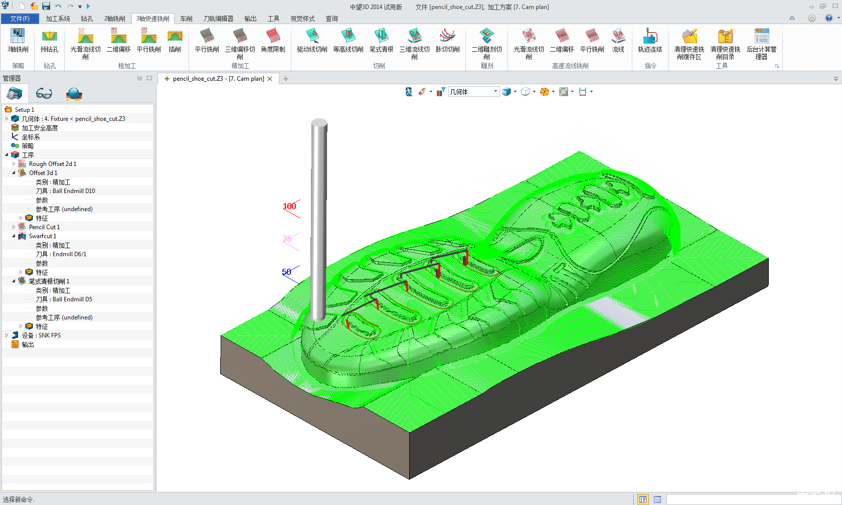(2)作为CAD/CAM一体化的解决方案,在后期的鞋模零件加工中,xelega3D提供2轴、3轴以及4、5轴的加工策略,目前在xelega3D中拥有超过40中的加工策略,包括高速精密铣削加工,3轴QuickMill加工,可以为编程工程师快速生成安全高效流畅的刀轨。