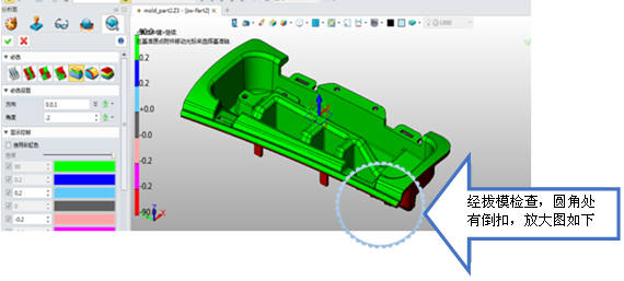 2. 发现倒扣现象,执行命令“拆分面”:按图示 选择圆角面,分割 采用侧影线 方向 选开模方向,即 Z轴,点击确认。