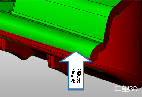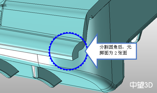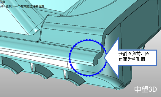 3. 分割曲面后,如图所示,把圆角分成了2个曲面,把倒扣分离出来,即提取出来了分型线