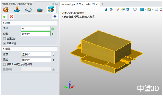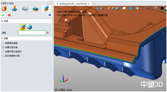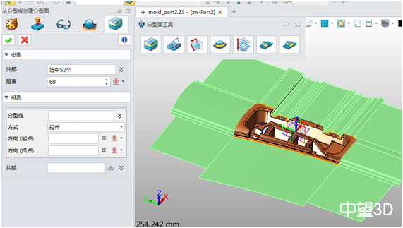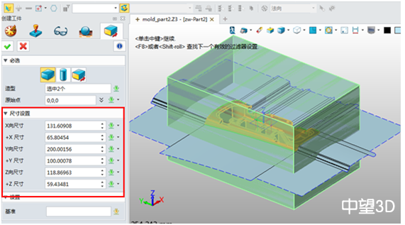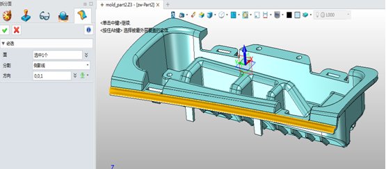 6. 剩下的就是做分型面了,xelega3D提供了自动分型面功能,只需设置分型面的长度,快速制作分型面,如图所示: