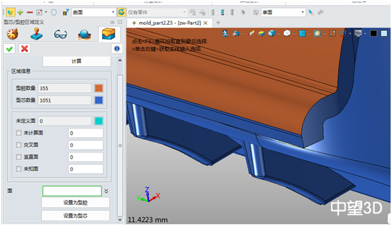 4. 拆分后,我们再来定义型芯/型腔区域,会发现倒扣面自动放置在型芯区域了,如图所示: