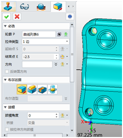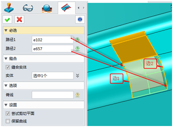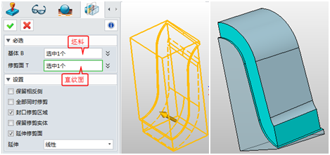 5. 使用修剪功能用直纹面把坯料一侧修剪掉,保留方向见下图,方向不对可以勾选下图的保留相反侧选项。