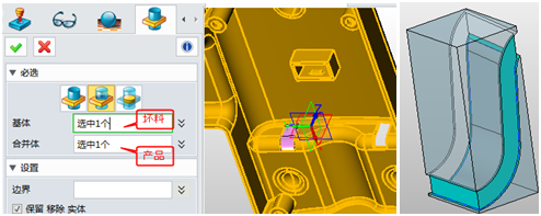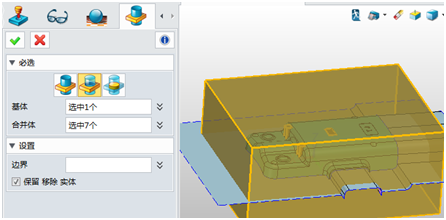 3. 利用组合功能使用产品对坯料进行布尔减操作,注意勾选保留移除实体,勾选后才能保留产品。