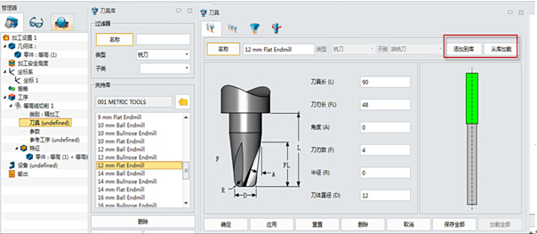 点击xelega3D自带的刀具库,如图2所示,选择所需要的刀具。也可以手动输入刀具名称和规格尺寸。此外,工程师还可以把一些特殊或者企业专业的刀具添加到xelega3D的刀具库中,方便以后调用。