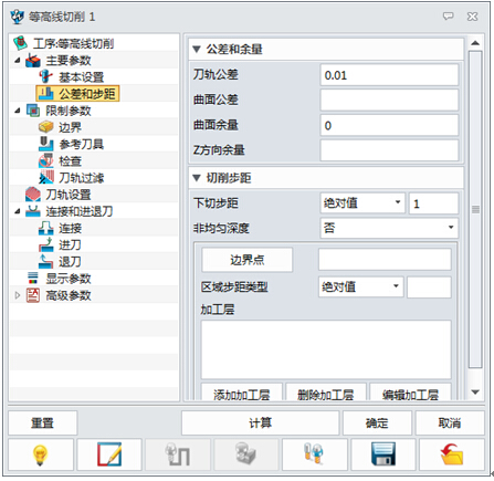 完成转速和进给的设置后,则需对刀轨公差、加工余量,以及下切步距进行设置,相关参数可参考图4。