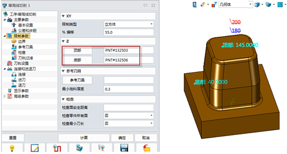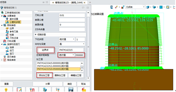 需注意的一点,如果由于产品加工需求需对非均匀下切步距进行设置,则可以通过添加边界点和步距,并添加到加工层来完成,如图5所示。