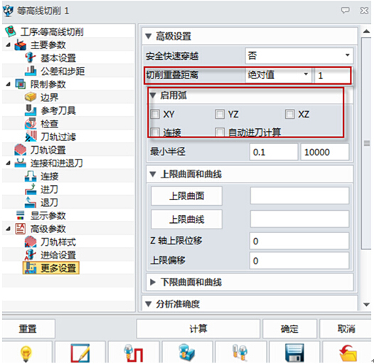 如图10所示,切削重叠距离设置为1MM以上,这样可以避免产生进退刀的痕迹;启用弧则不作勾选,这样输出的G代码为高速代码,可以提高加工效率。