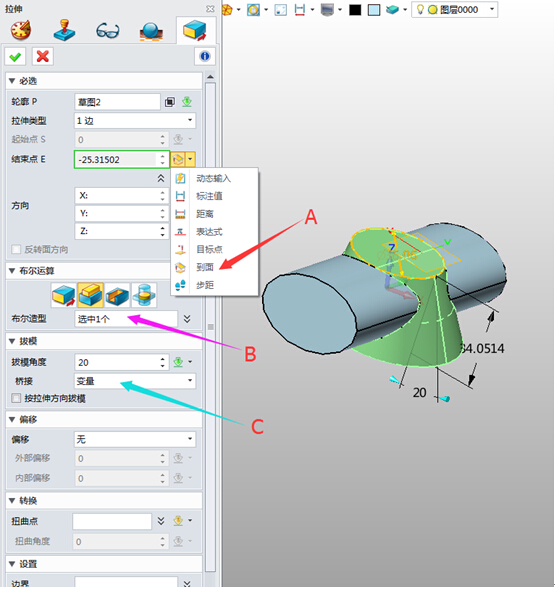 标识B:这里可以将当前的拉伸特征进行加、减、交等“布尔运算”,也可在做某些拉伸特征时,根据需要选择部分已有特征进行“布尔运算”。