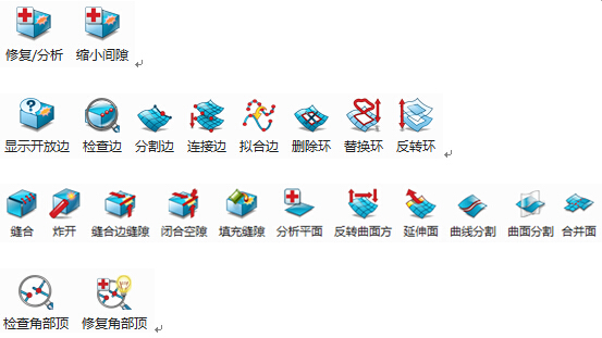 以下是xelega3D修复功能方面的各个操作键,工程师在导入模型,或者在产品设计过程中,如果有修复需要的话,则可通过以下丰富的功能来操作完成。