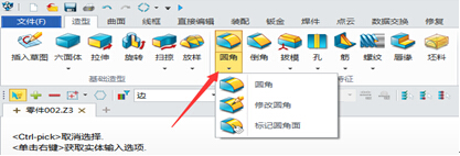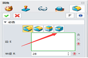 xelega3D提供了多种不同倒圆角的模式供大家选择,如图3所示,箭头所指的4项倒圆角模式,从左到右依次为:圆角、椭圆圆角、环形圆角、顶点圆角,其中,“顶点圆角”这个模式,为设计师的圆角工作增色不少。