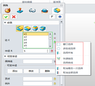 选择所有:选择所有边线进行倒圆角,使用此命令时,可以在左侧的列表(边E)中将不需要边线删除掉。