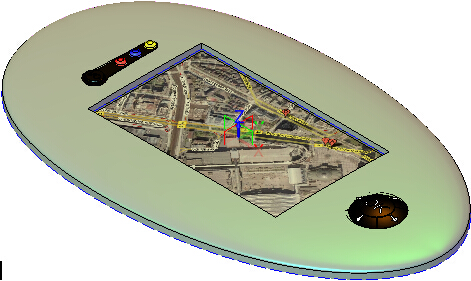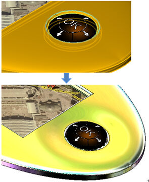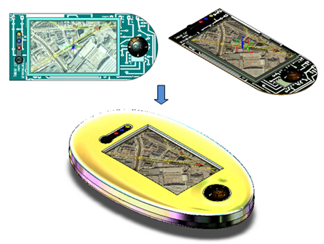 首先我们来看看产品设计前与设计后的效果对比,如图1所示,这是一个完整的导航仪,以及导航仪内部的三维电器和结构部分,包含电路板、操控按钮和显示屏等。本实例的任务,就是要基于这些现成的内部电路板、操控按钮、显示屏等,设计出整个GPS的外壳。