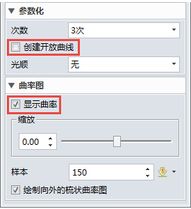 第二步:要把“创建开发曲线”的复选框拿掉,同时打开“显示曲率”复选框,如图3所示,以方便观察样条曲线的光顺程度。