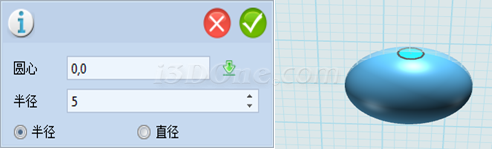 5、选择平面绘制区域,点击草图绘制,选择圆形,输入圆心(-5,0),半径5,可得: