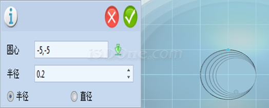 9、选择平面绘制区域,点击草图绘制,选择圆形,输入圆心(-5,-5),半径0.2,可得: