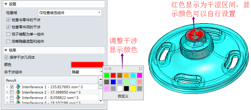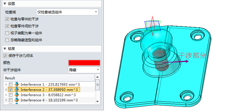 在xelega3D干涉结果显示中,系统默认的是只显示干涉的零部件,其他部分系统将自动隐藏,如果设计师想显示其他部,则可以在“非干涉部件”的下拉菜单中选择。