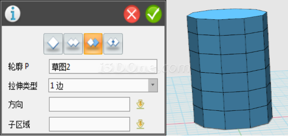 2、选择特殊造型,点击拉伸,选中刚才绘制的造型,输入拉伸高度70,中键确定,可得: