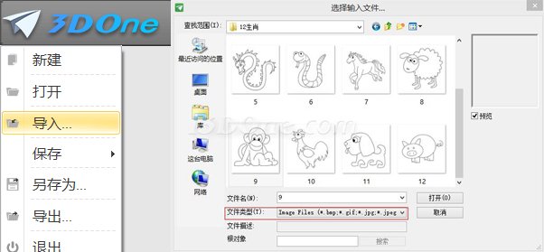 第二步,选择菜单栏“导入...”,弹出对话框中选择你下载好的生肖图片,单击打开,将图片导入到草图界面。注意文件类型选择“Image Files..... ”。
