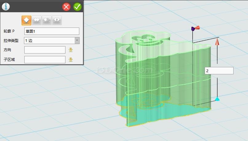 第五步,单击完成,退出草图编辑,选择拉伸命令对草图进行拉伸。(注意:能拉伸出实体的,说明修剪成功,否则退回仔细检查是否还有多余线段或是未闭合区域。)