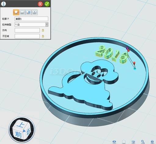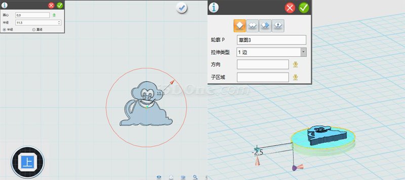第六步,至此,后面的步骤你就应该会了。绘制圆形印章,绘制圆形并拉伸。(当然你也可以选择其他形状,尺寸根据猴子图案自行调整)