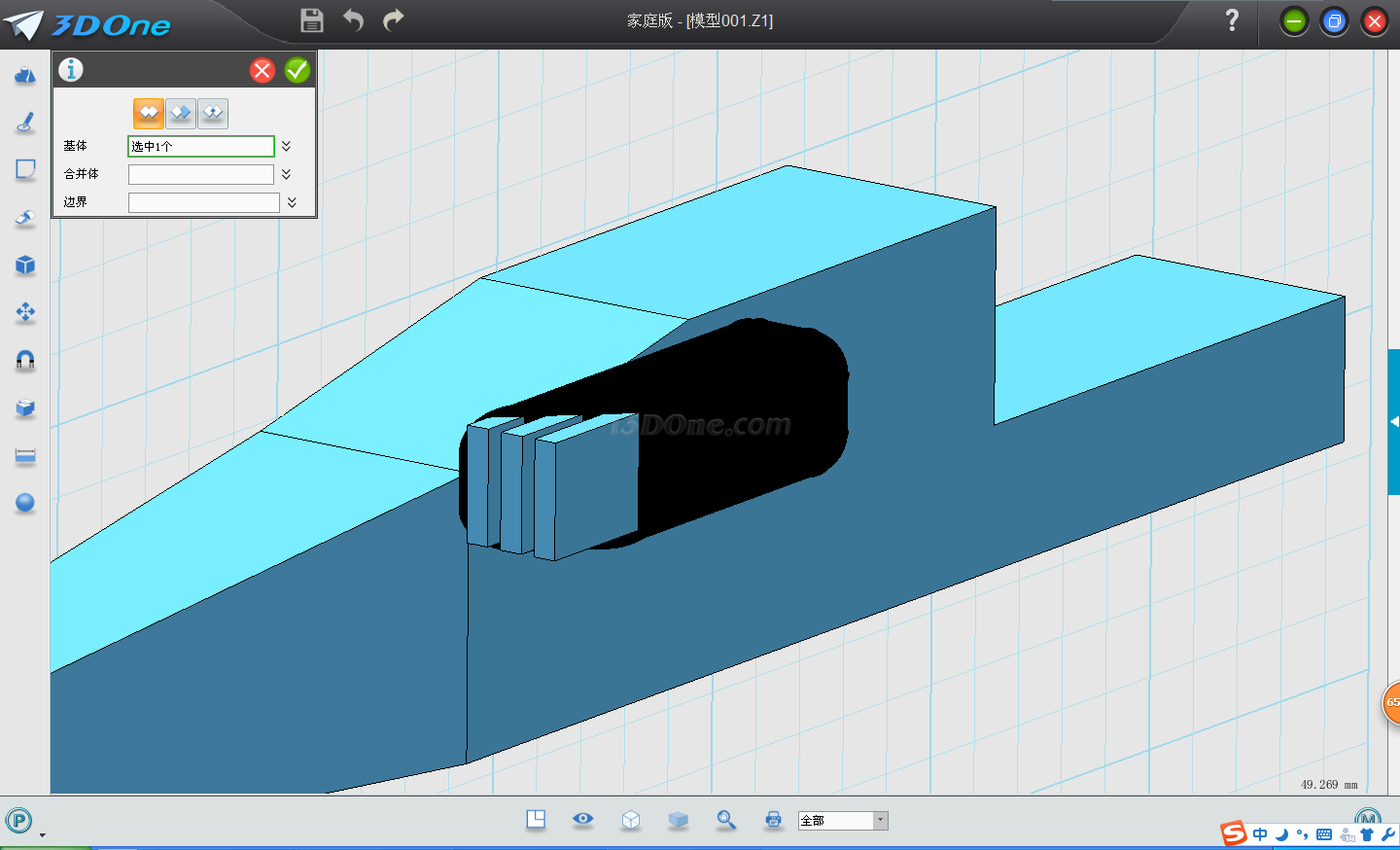 11. 使用组合编辑→减运算,基体选择实体分割后的实体,合并体选择阵列的三个长方形。