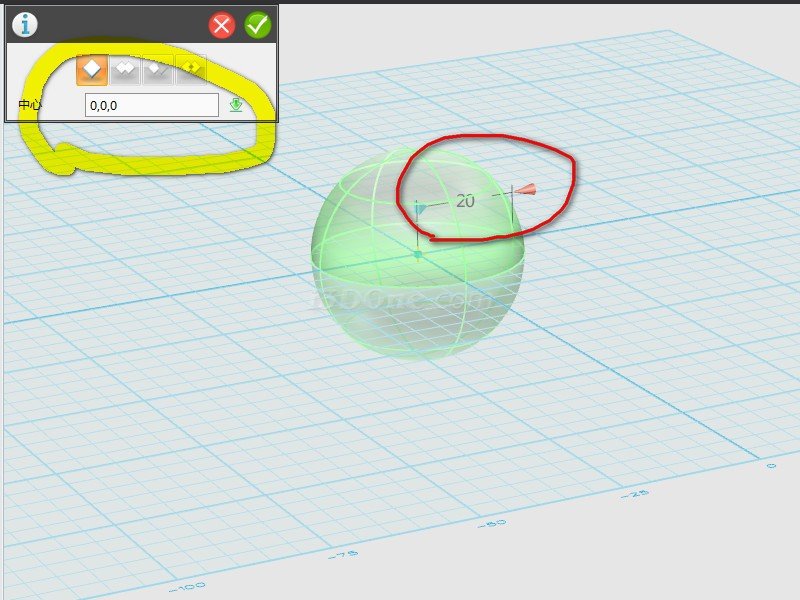 2.选择实体工具—球体,输入球体中心(0,0,0),半径20。