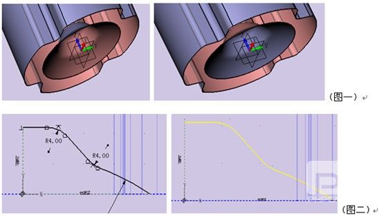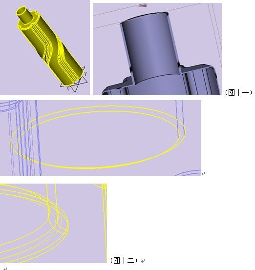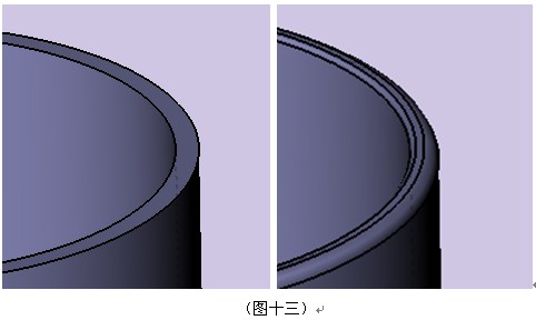 ,由于瓶嘴与瓶身厚度不同,在连接处的两条边有不同的圆角半径,内部边的圆角半径=外部边圆角半径+瓶嘴厚度(图十二)。